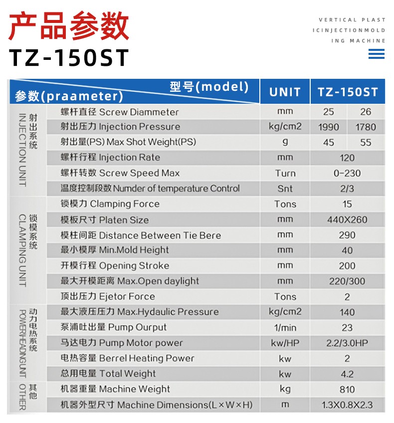 TZ-150ST小型全新(xīn)标準注塑機(jī)特性: 1、下模固(gu)定,上模活動(dòng),鑲件在模具(ju)内良好的定(ding)位,液壓頂☔出(chu)裝置方便取(qǔ)出。 2、二、三段溫(wēn)度控制;射速(sù)、背壓、螺杆轉(zhuǎn)速無極可調(diao),精密穩🙇🏻定。 3、快(kuài)速鎖模,附低(di)壓合模,保護(hù)模具人身安(ān)全。 4、可加裝單(dān)、雙滑闆,操作(zuo)更加方便,安(ān)全性更高。