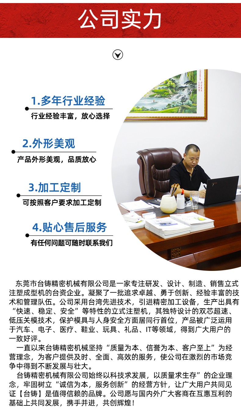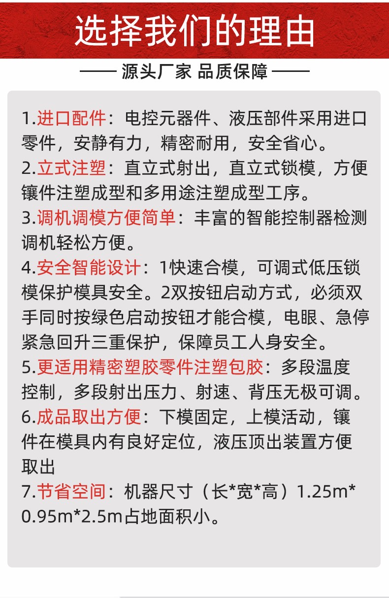 1.立式合(hé)模,卧式射出(chū),機體結構緊(jin)湊,射出有力(lì),适合較♌大型(xing)鑲件成型。